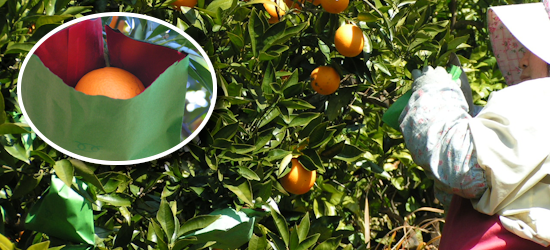 【柑橘の袋がけ作業】袋がけ作業は、晩秋から~2月頃まで行います。清見オレンジ、デコポン、カラマンダリン、バレンシアオレンジなどの柑橘に一つひとつ袋を掛けていきます。(小学校高学年~一般)