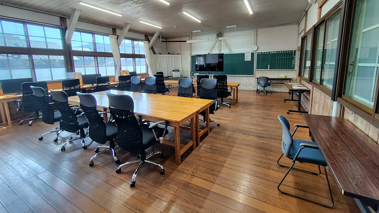 昭和の小学校の教室をそのままに会議室として利用できます。普段から、会議やテレワーク、研修に利用しています。